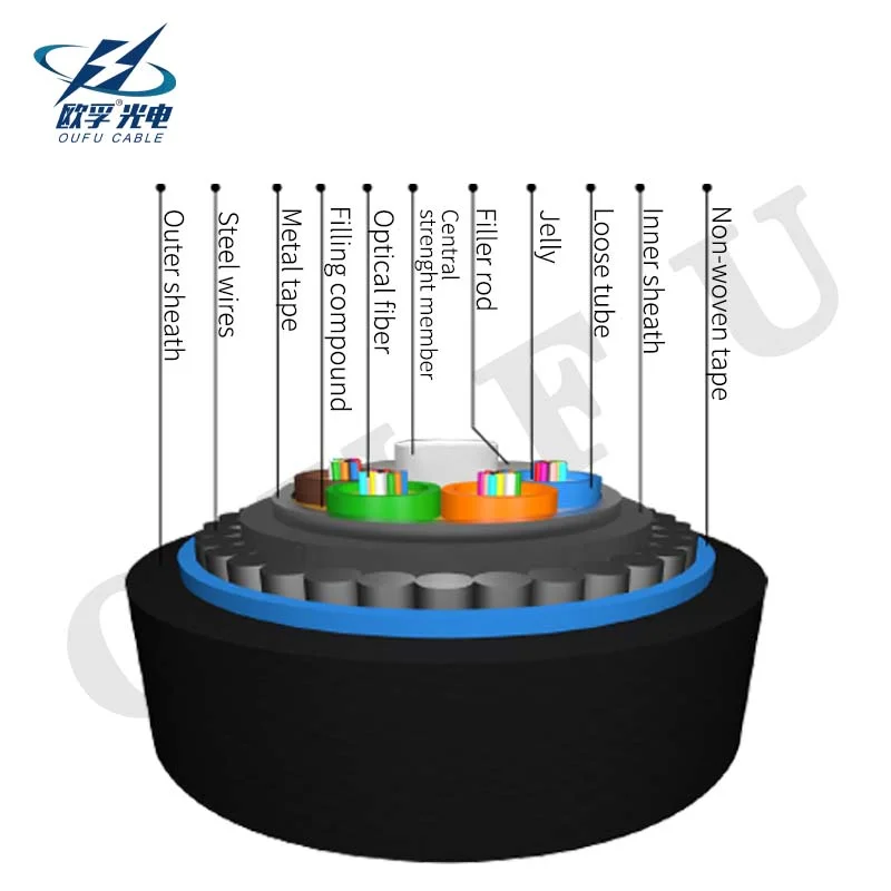Fiber optic cable GYTA33, 2~72 fibers, central strength member (steel), jelly-filled, fiber contained loose tube and pp filler (if necessary) stranded, water blocking jelly, copolymer coated aluminum tape, pe inner sheath, arᒡᔦᔑd by a layer of steel wires, pe outer sheath. G652d sm fiber, detailed specification on your request.